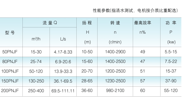 九十年代引进日本技术、研制开发系列渣浆泵,系单级单吸离心式衬胶泵,可输送各类有腐蚀性渣浆及固体颗粒的矿浆。输送矿浆大浓度不超过百分之六十五(重量计),温度不得超过100℃,被广泛适用于冶金、矿山、金矿、铜矿、锌矿、铅矿、锰矿、矾矿、石油、化工、煤炭、电力、交通、河流疏浚、建材及市政工程等等工业企业的工况岗位。小型泵采用金属骨及特种橡胶模压成形;大型泵采用活络衬胶,减少维修费用,80PNJF、100PNJF、150PNJF的排出口在270℃范围内可按45℃间隔转不同的方向,在没有特殊说明的情况下,一律为垂直向上出口,泵的旋转方向,为泵盖所示标尖头方向旋转。